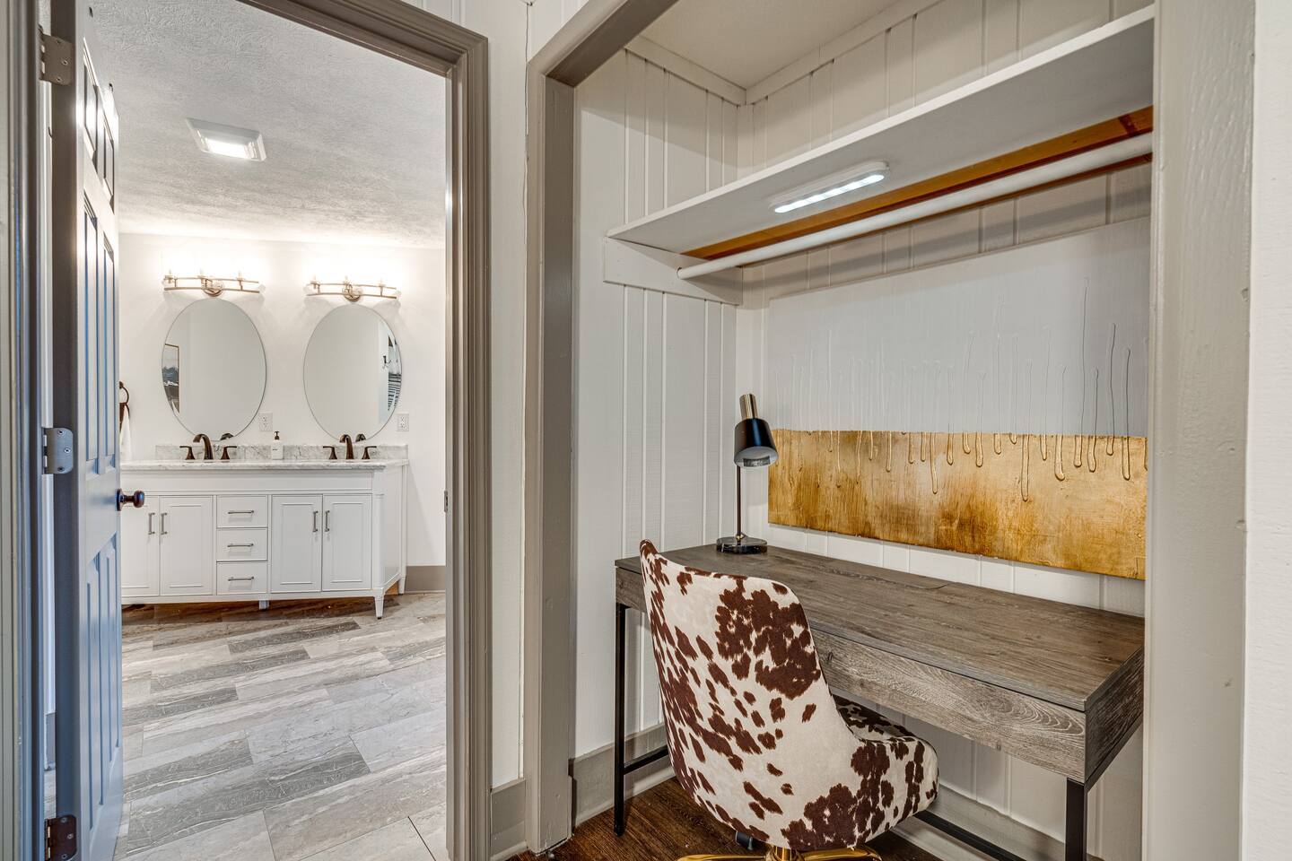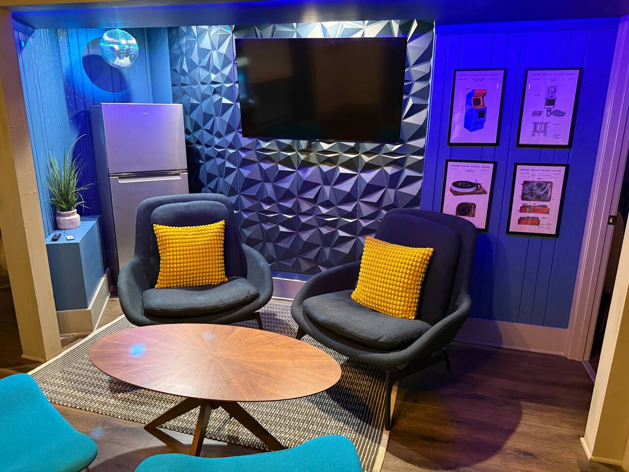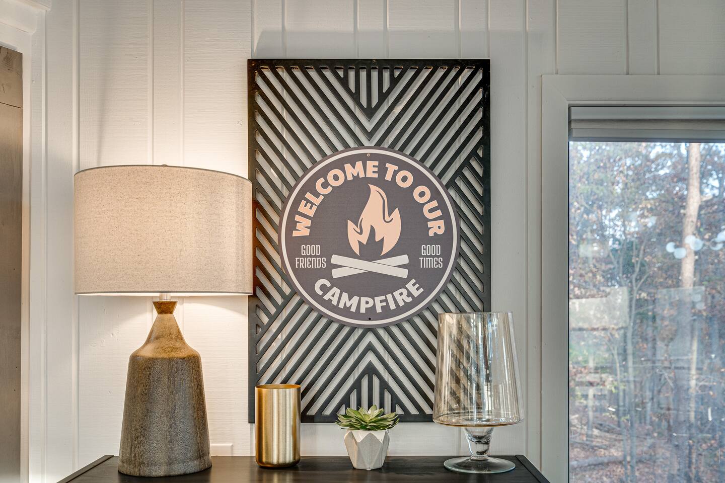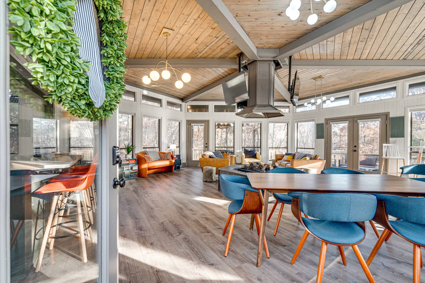 Treetop Hexagon inside Massanutten Resort. Relax by the indoor gas fire pit, soak in the private hot tub, and laugh with group karaoke contests. Unique mid-century modern lodge brought to you by CampfireLodges. Fun: 360° TVs, TV in every room, blazing WiFi Cook: chef's kitchen off great room (keep the group together!) - coffee bar & deck grill ~5 mins to skiing, water parks, golf, dining & wineries - yet peaceful among the pines. Book now before your dates disappear!