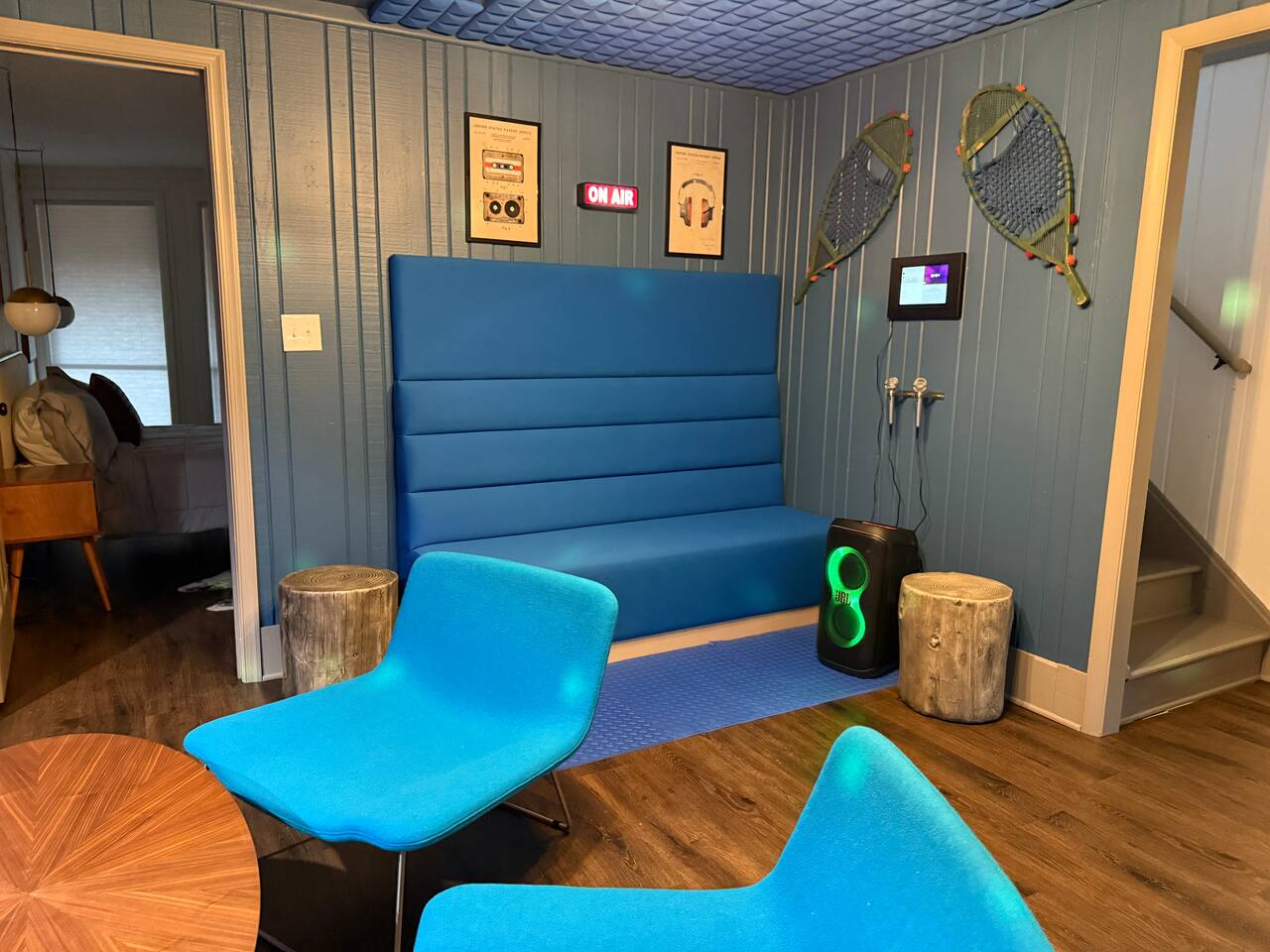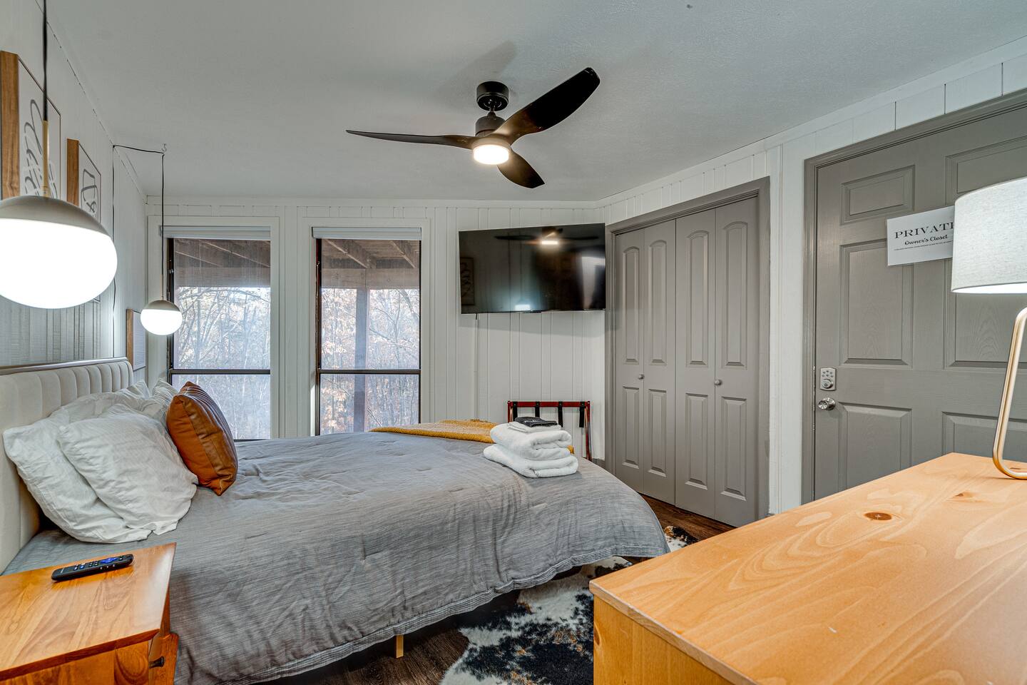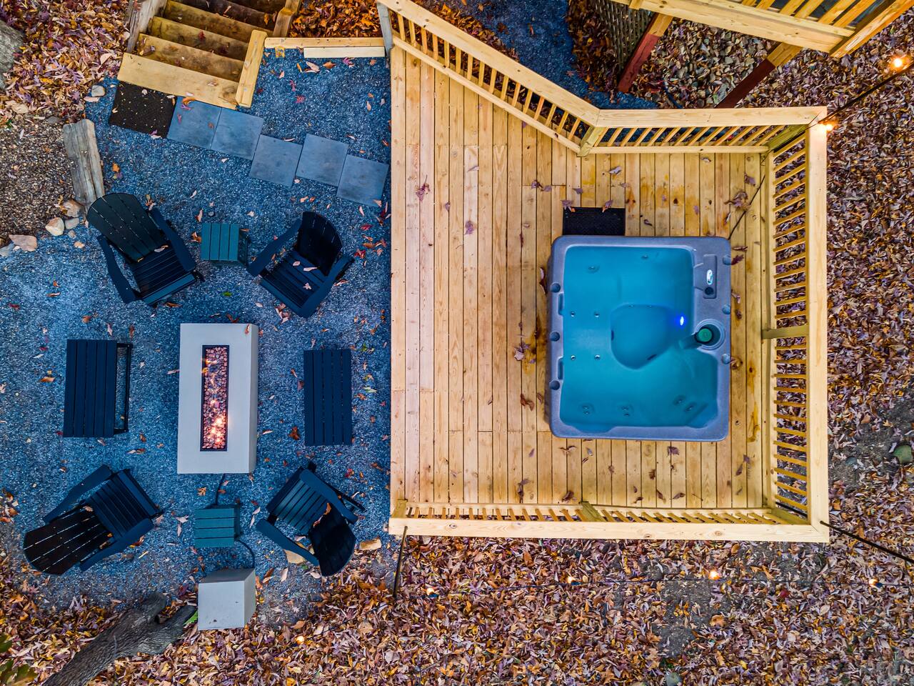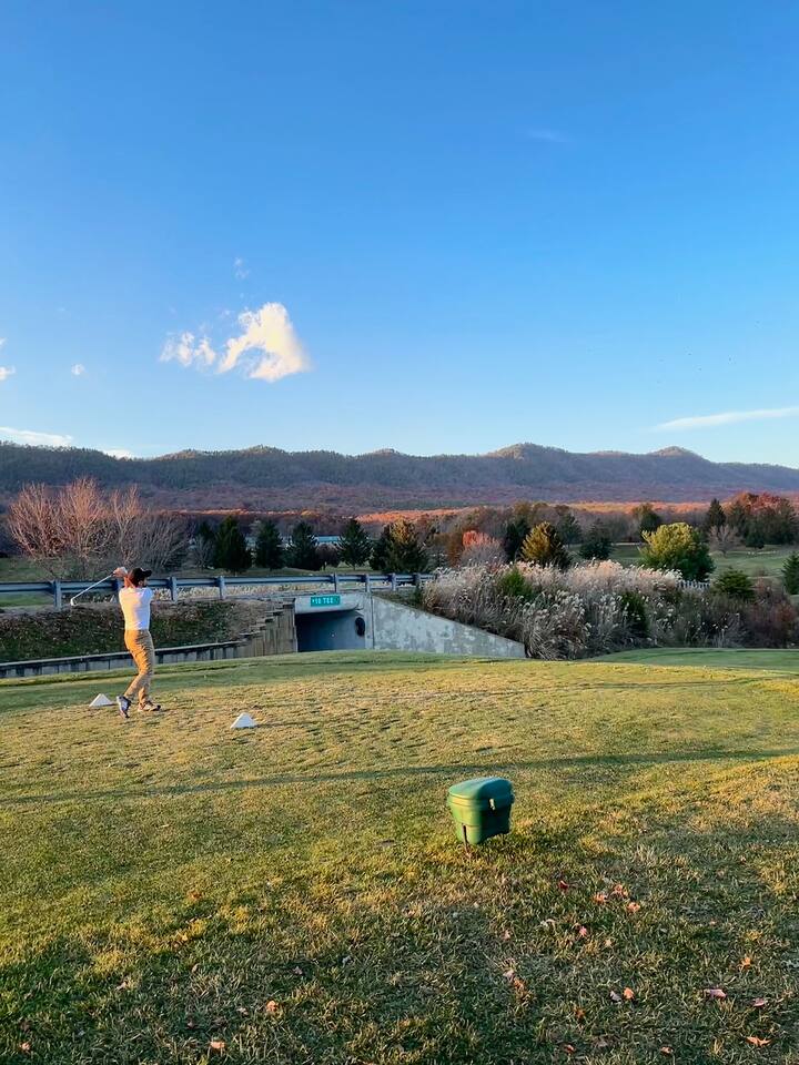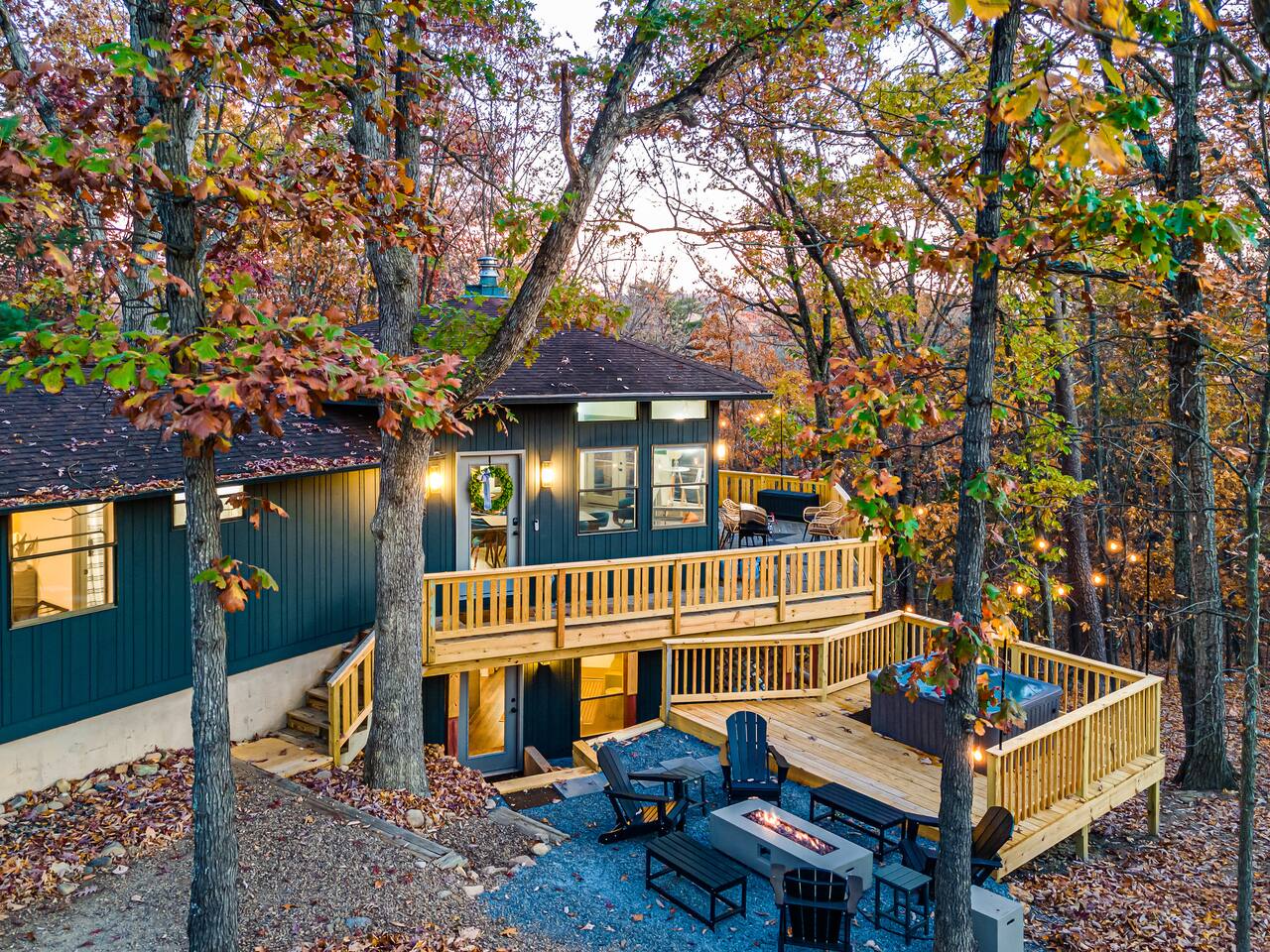 🔥 Highlights: • Signature indoor fire pit in a hexagonal great room • Private hot tub for post-adventure relaxation • Wrap-around deck with screened-in seating area, outdoor dining, and grill with propane included • Fully equipped kitchen for gourmet meals • Smart TVs in every room with Roku and YouTube Live TV provided • High-speed WiFi throughout • Centrally located to Massanutten Resort amenities 🛏️ Sleeping Arrangements: • Upstairs (Bedroom 1): King bedroom with ensuite bathroom • Downstairs: Bedroom 2: Primary Suite w/ Queen bed and workspace Bedroom 3: Queen bed • Kids' room (Bedroom 4): 2 Twin bunk beds in a campout-themed space • Additional: Fold-out loungers and 2 couches 🏠 Layout: • Open-concept living area with central firepit • Fully stocked kitchen with modern appliances • 4 bathrooms - Upstairs: 1 full in bedroom, half bath in hallway - Downstairs: 1 full in primary suite, 1 double vanity + tub, 1 half bath separate from shower room • Downstairs karaoke room w/ arcade • Dedicated workspace in primary bedroom 🌲 Outdoor Living: • Expansive wrap-around deck • Screened-in porch for bug-free dining • Multiple deck seating options to enjoy both sunrises and sunsets • Hot tub for stargazing and relaxation • Propane Firepit with premium poly Adirondack chairs and benches for 10 • Grill + propane provided for BBQ enthusiasts 🎿 Location Perks: • Minutes from Massanutten Resort activities: - 8 minutes to Skiing and snowboarding - Zip lining and family adventure park - Minigolf, bumper cars, go-karts, community pool - Hiking, extensive mountain biking trails - 4 minutes to Indoor and outdoor waterparks - 2 minutes to Golfing - 20 minutes from Shenandoah National Park Swift Run Gap entrance • Short drive to Shenandoah National Park, Luray Caverns, wineries, and breweries 🐾 Pet-Friendly: • Up to 2 pets welcome (pre-approval required) • $45 per pet, per night ✨ Extra Touches: • Fully stocked with linens, towels, and toiletries • Coffee bar for your morning brew, including single-serve or 12-cup brewing and a French Press • Kid-friendly amenities (high chair, safety gate, kid-safe dishes) • Keyless entry for convenient check-in